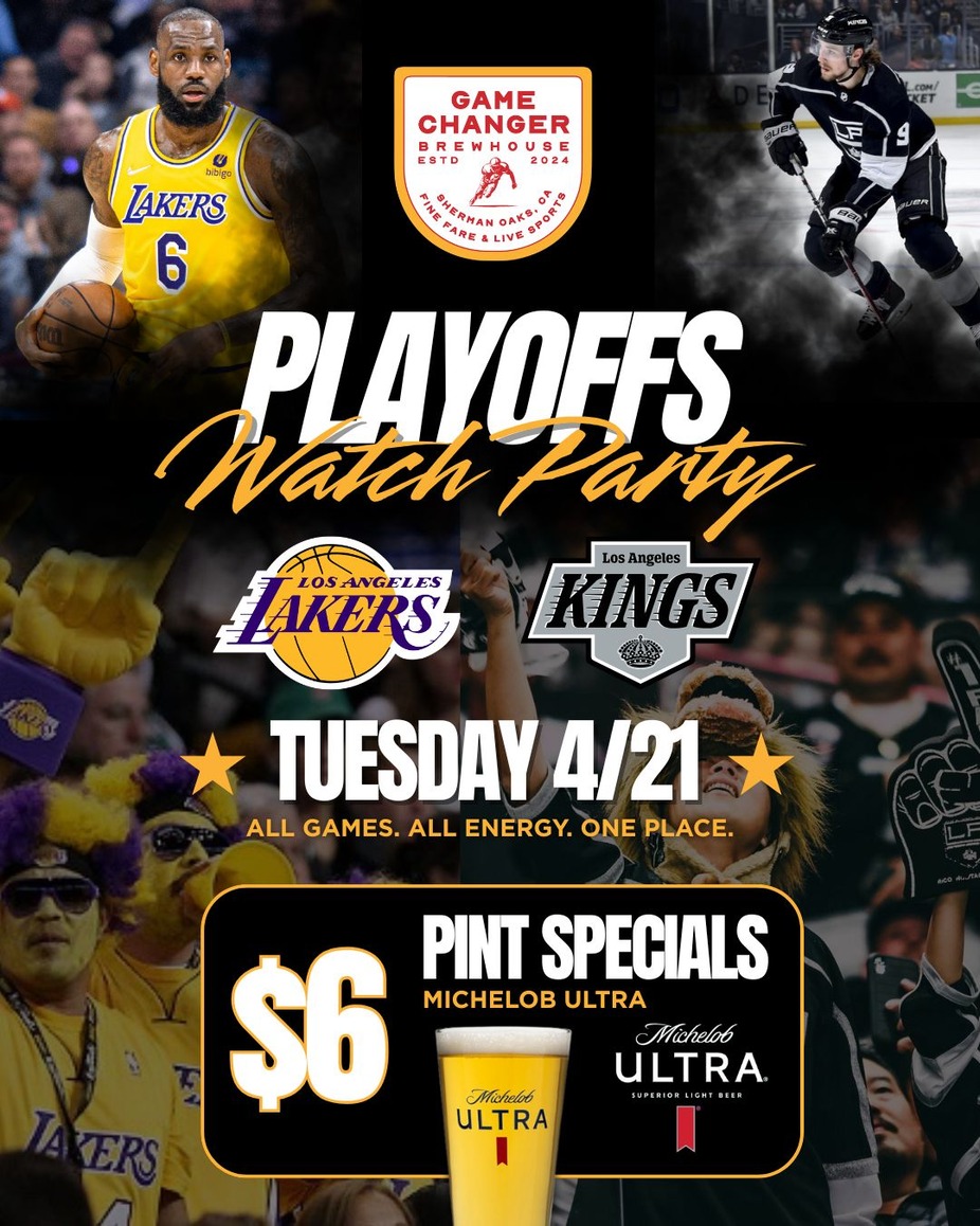 Catch every moment of the playoffs at Game Changer Brewhouse with our Lakers & Kings Watch Party on Tuesday, 4/21. From tip-off to puck drop, we’re showing all the action on big screens with full sound so you don’t miss a second. Fuel the night with elevated eats and enjoy $6 Michelob Ultra pint specials while you cheer on LA. Whether you’re repping purple and gold or black and silver, this is the place to watch playoff energy come alive. Reserve your table and experience it all with us.