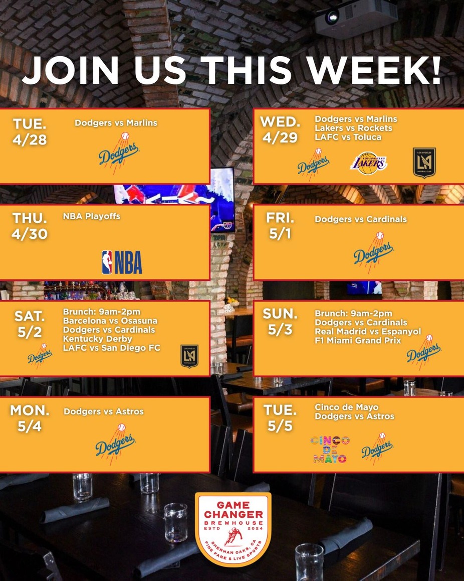 Join us for a HUGE week at Game Changer Brewhouse. NBA & NHL playoffs are finally in motion and we have Dodgers games all week long. Book your reservations now at gamechangerbrewhouse.com!