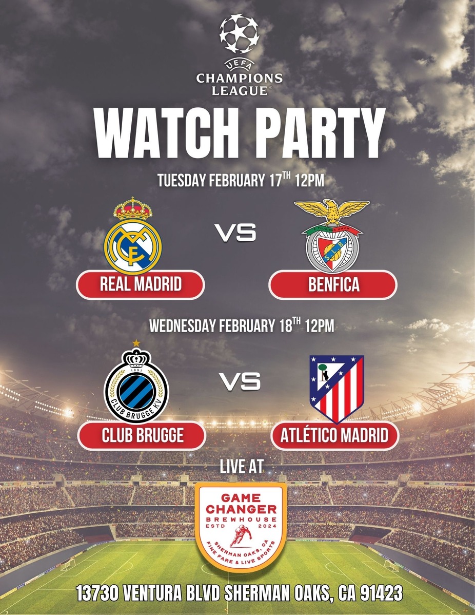 UEFA Champions League — Tuesday & Wednesday ⚽🔥 Midweek magic is here! Headlining the slate: Real Madrid vs. Benfica and Club Brugge vs. Atlético Madrid—European giants, knockout intensity, and statement-making moments you won’t want to miss. We’re showing every match on wall-to-wall screens with full sound at Game Changer Brewhouse. Grab the crew, fuel up with match-day bites and ice-cold pints, and lock in your table now for Champions League action at GCB!