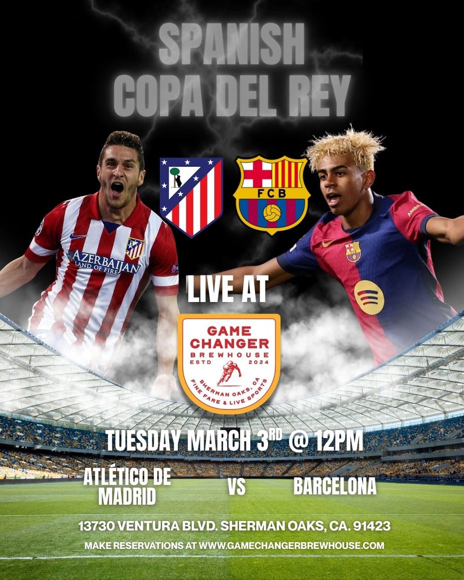 Experience the intensity of the Copa del Rey as Atlético de Madrid takes on FC Barcelona live at Game Changer Brewhouse on Tuesday, March 3rd at 12PM.