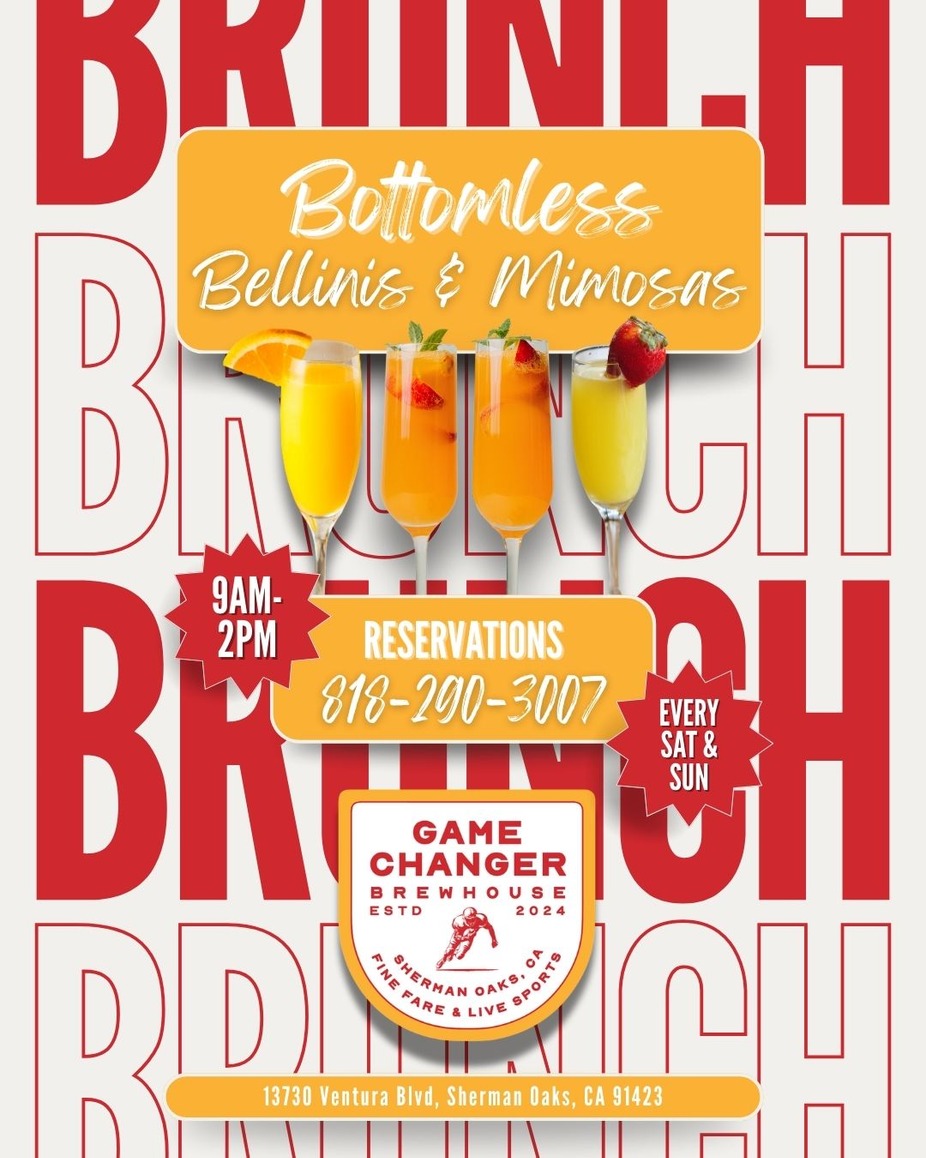 Join us every Saturday and Sunday at Game Changer Brewhouse for our signature Weekend Brunch from 9AM-2PM Enjoy a specially curated brunch menu paired with bottomless mimosas and bellinis in a lively, elevated setting. Whether you’re starting your day with friends or turning brunch into an all-day event, GCB delivers bold flavors, craft cocktails, and the perfect weekend vibe in Sherman Oaks. Reserve your table and make brunch your new tradition. 🥂